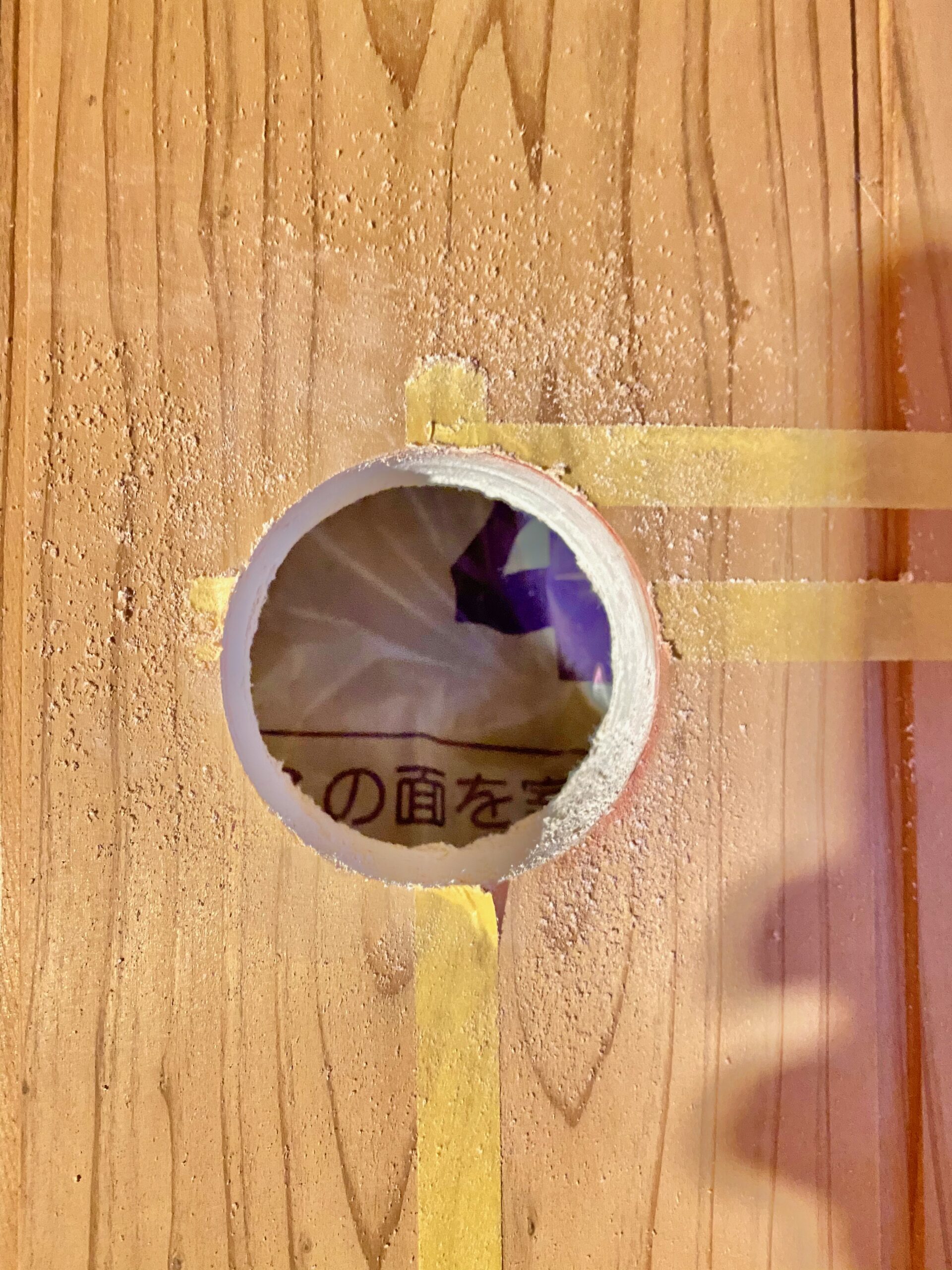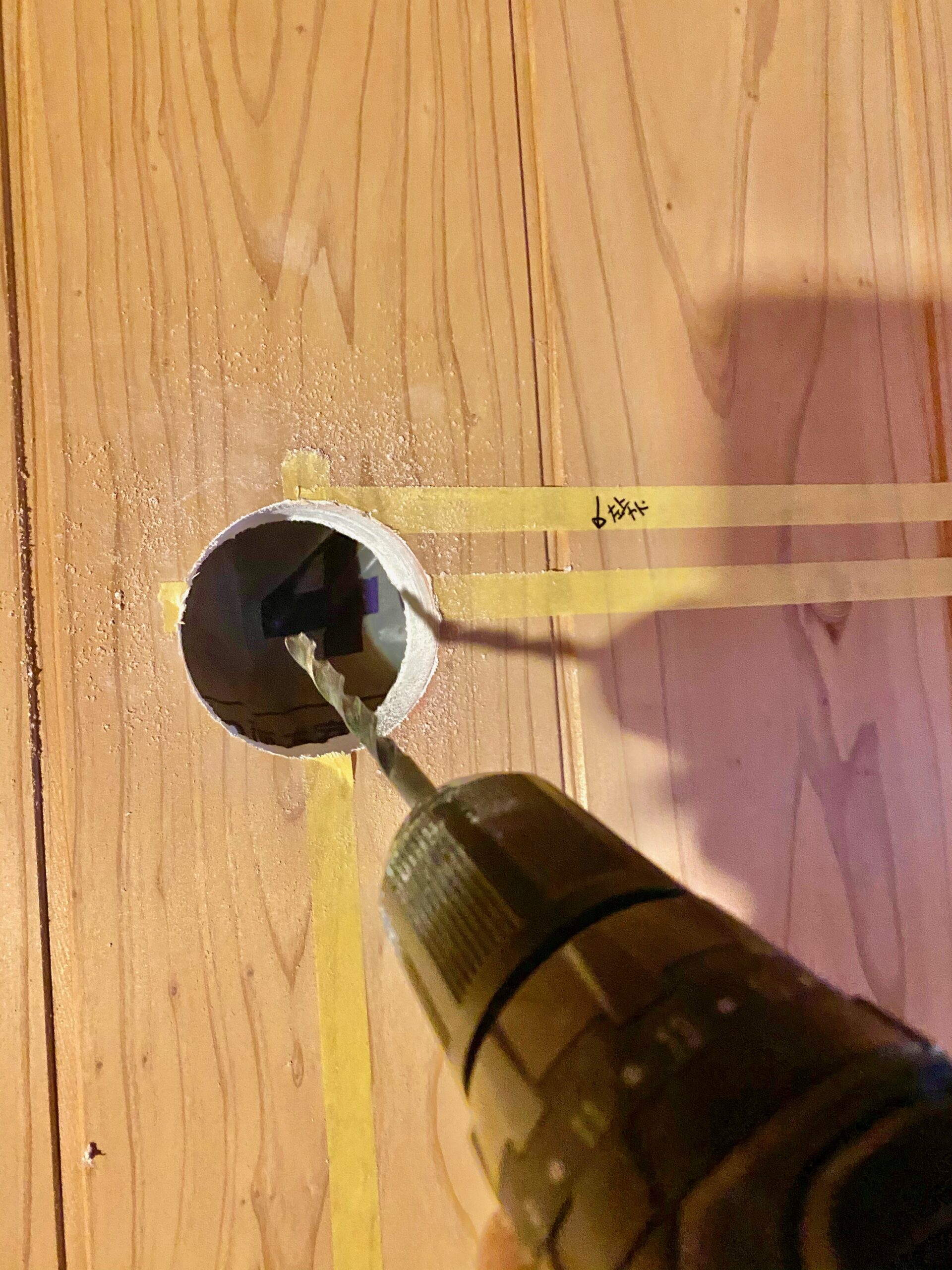 バルコニー側からも穴を開けるために中心に目安の穴を開けます。ホースに勾配を取る必要があるので、少し下側に穴を開けます。