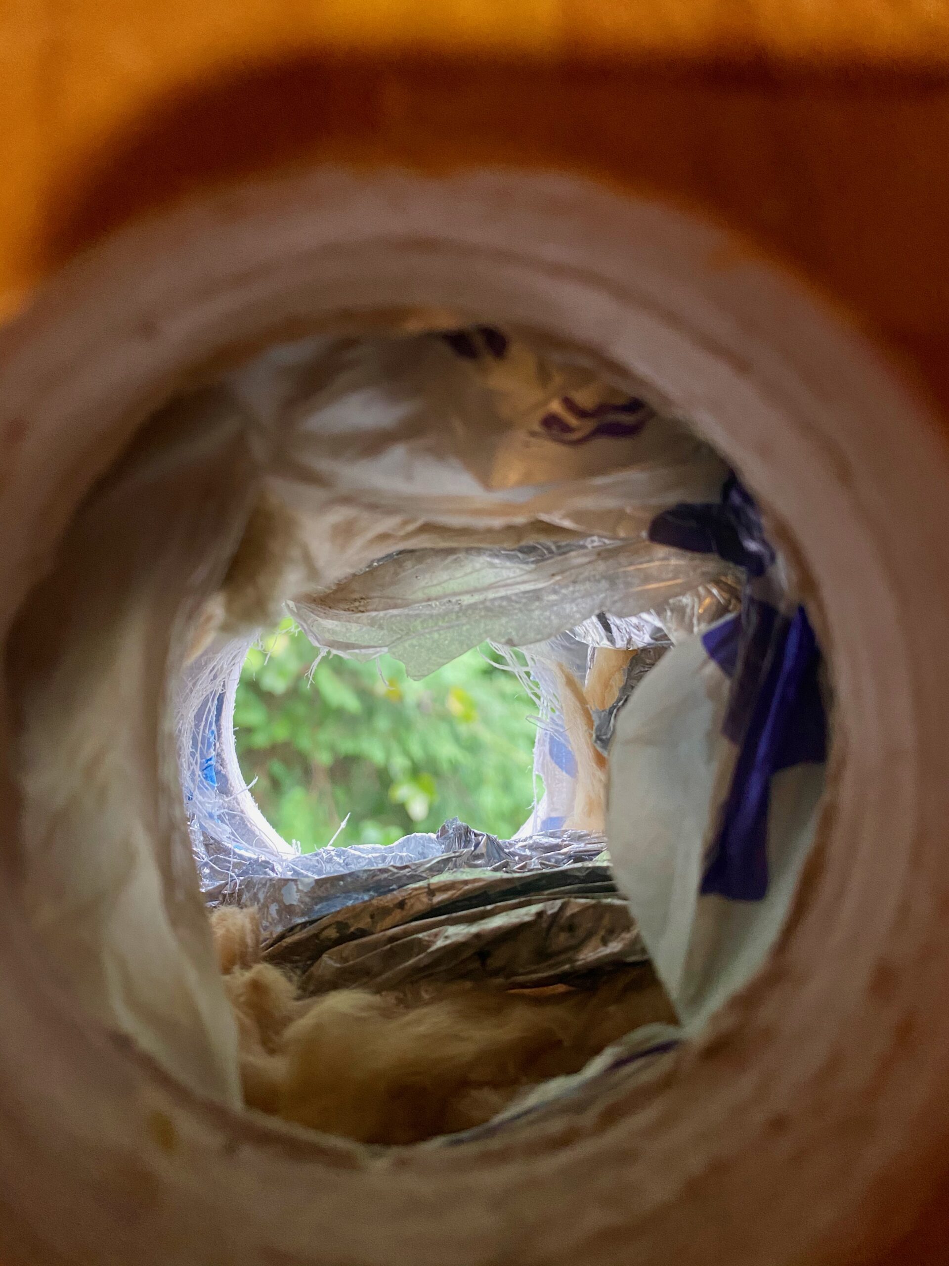 仮組みが終わり、枠を付けて、パテで埋めます。ホースに傾斜をつけつつ、最終的な出口は地面に対して垂直にしないと虫よけの蓋が開いてしまうので出口は垂直に調整します。