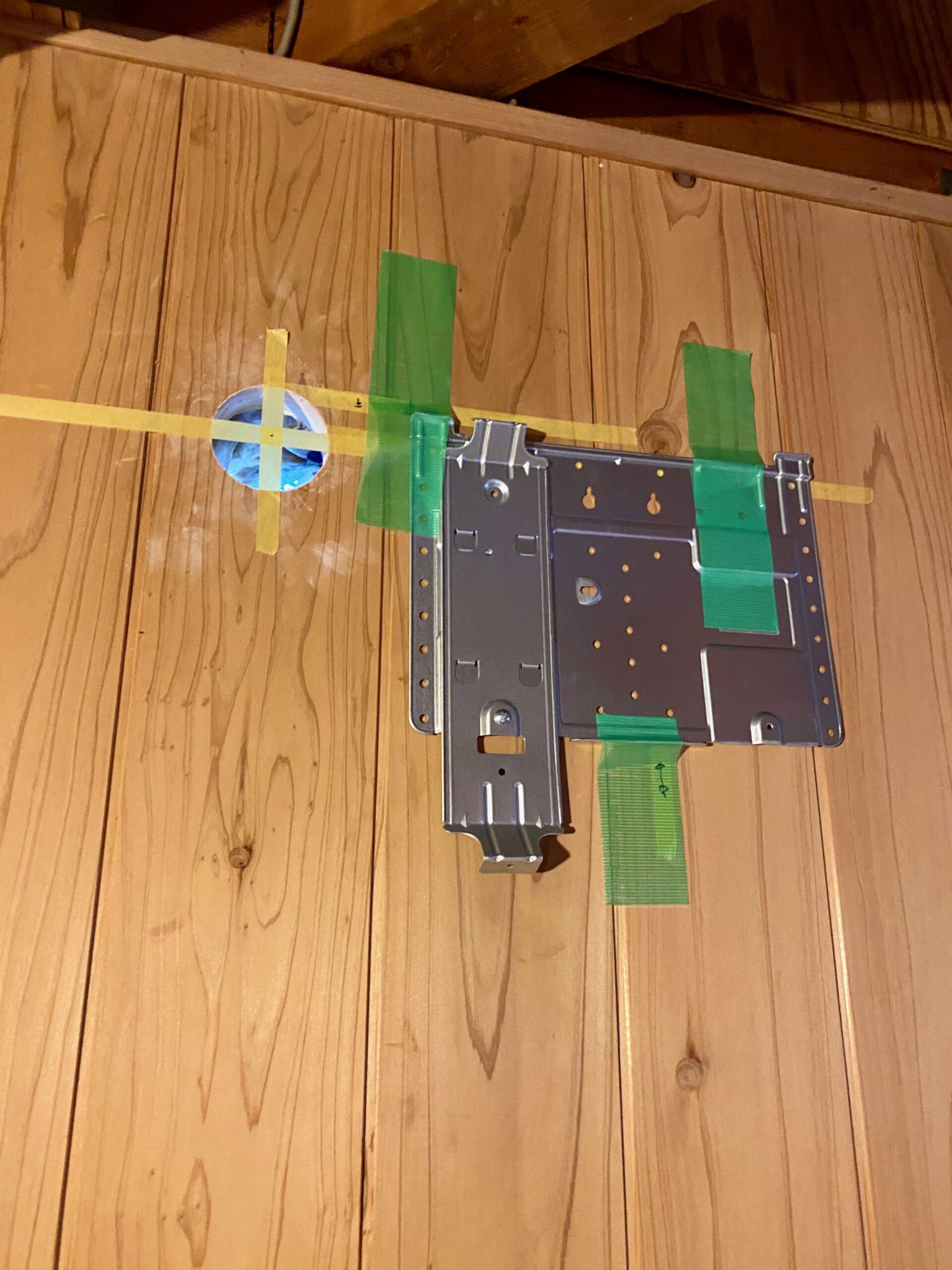 穴が空いたので、穴の位置から相対位置が決まっているカライエを取り付ける金具をテープで止めておきます。