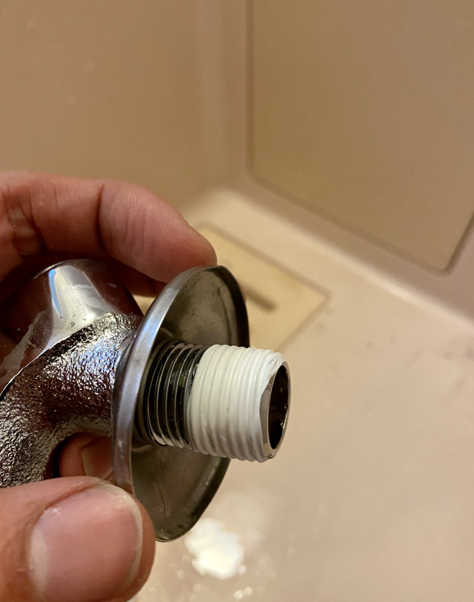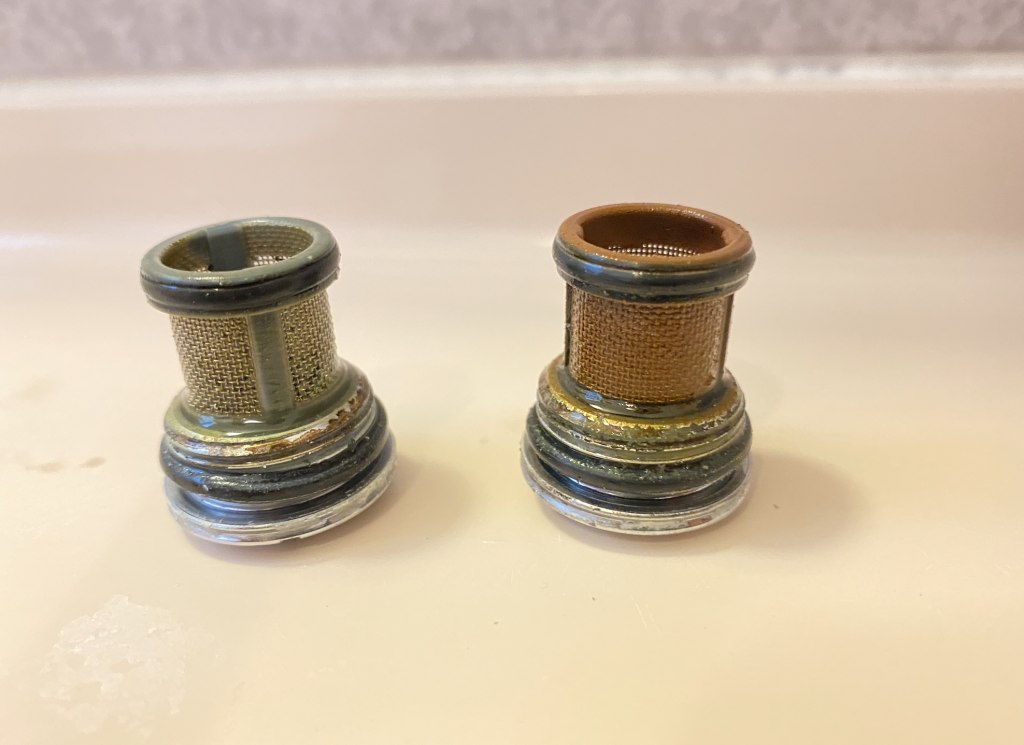 次に既存の水栓を取り外します。右側が水用のフィルターで、赤錆が付着しています。