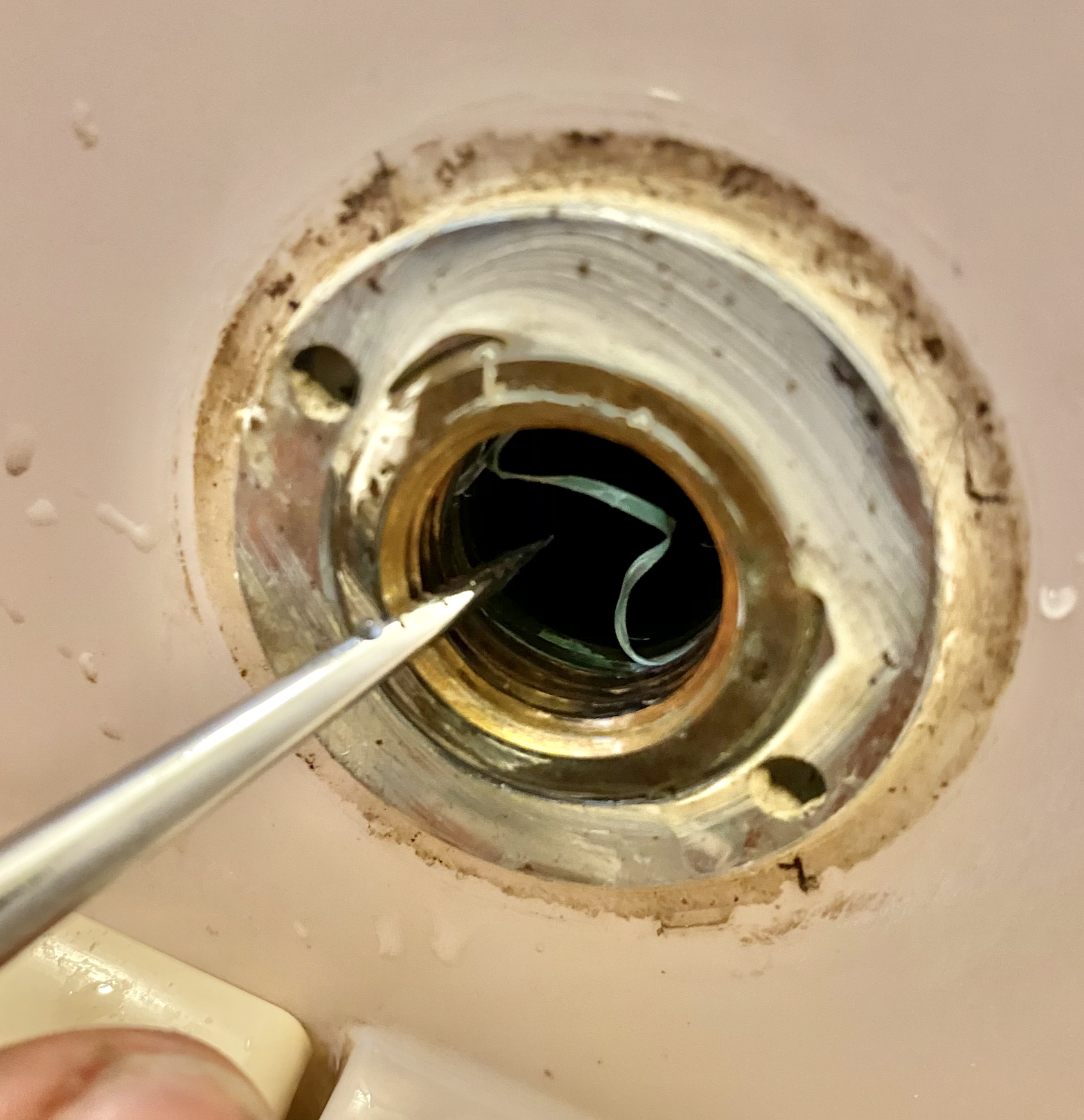 配管に残っているシールテープを、先端の尖った工具で除去します。