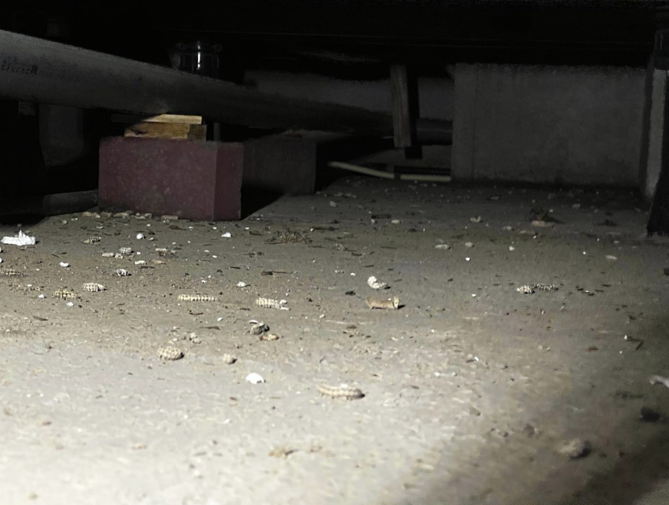 床下点検口から確認したところ、多数のヤスデの死骸が確認されました。